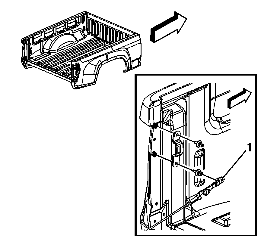 3. Remove the support cables (1) from the endgate striker bolt heads on each side, by sliding the cables forward until the bolt head can be removed from the keyhole slots.