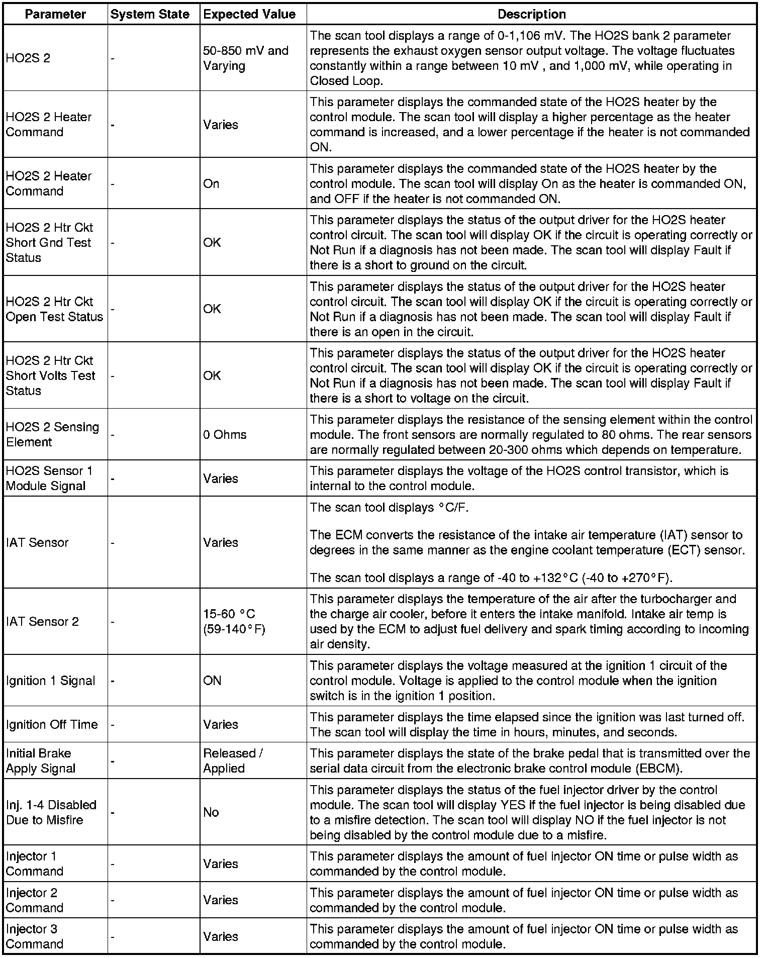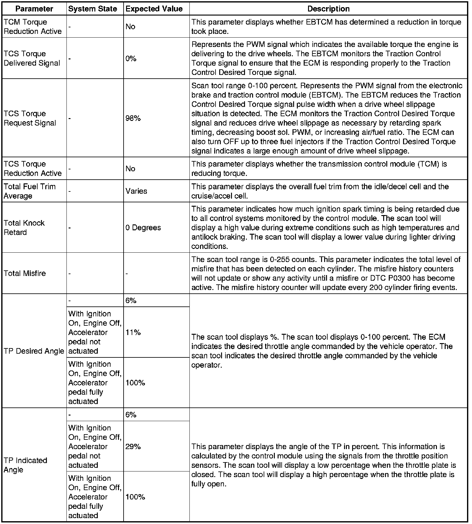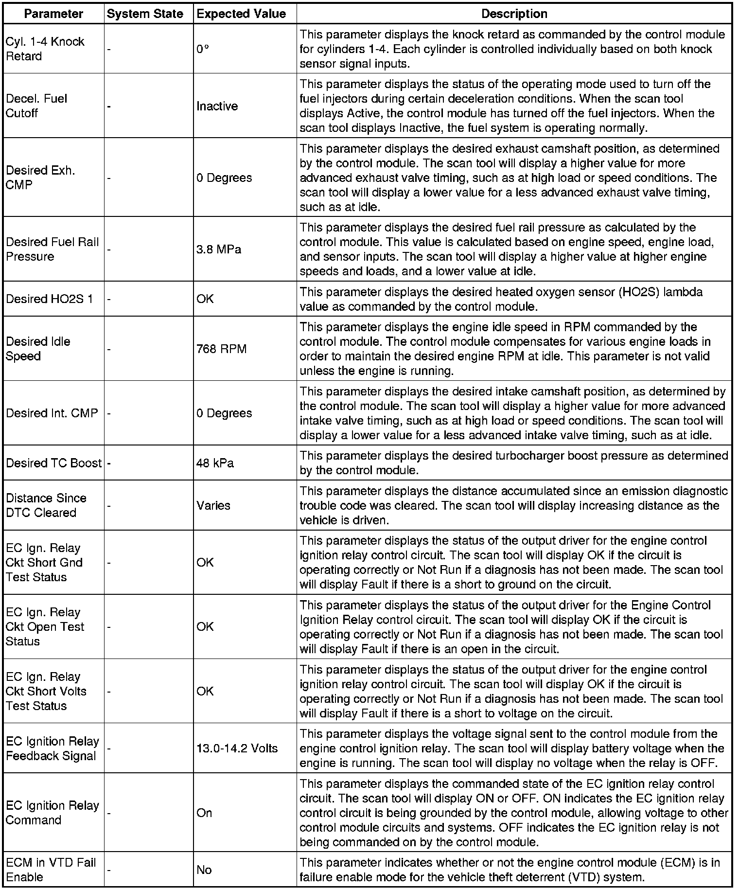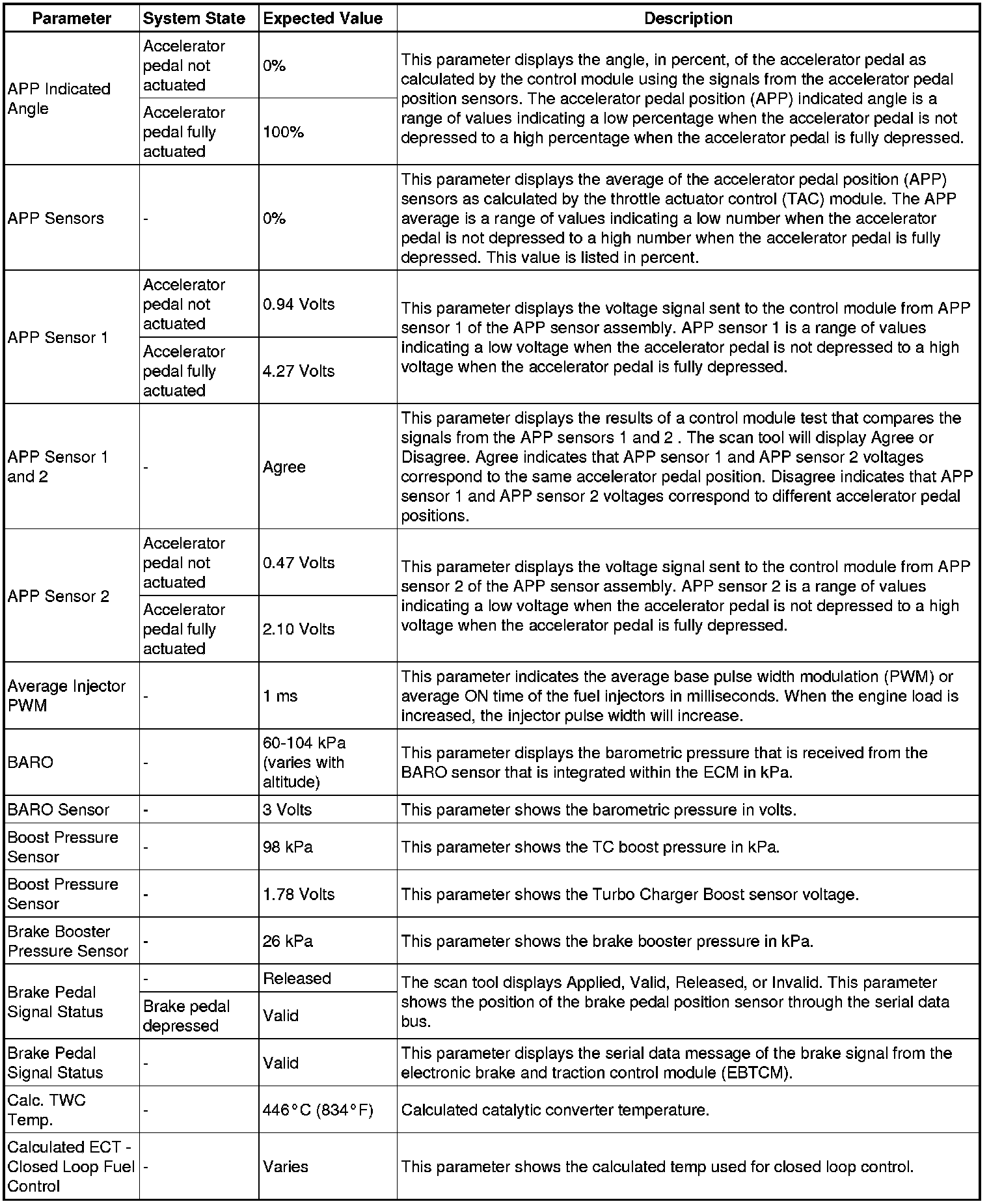 Only the parameters listed below are referenced in this service manual for use in diagnosis. If all values are within the typical range described below, refer to Symptoms - Engine Controls (Symptoms - Engine Controls) for the 2.0L engine for diagnosis.