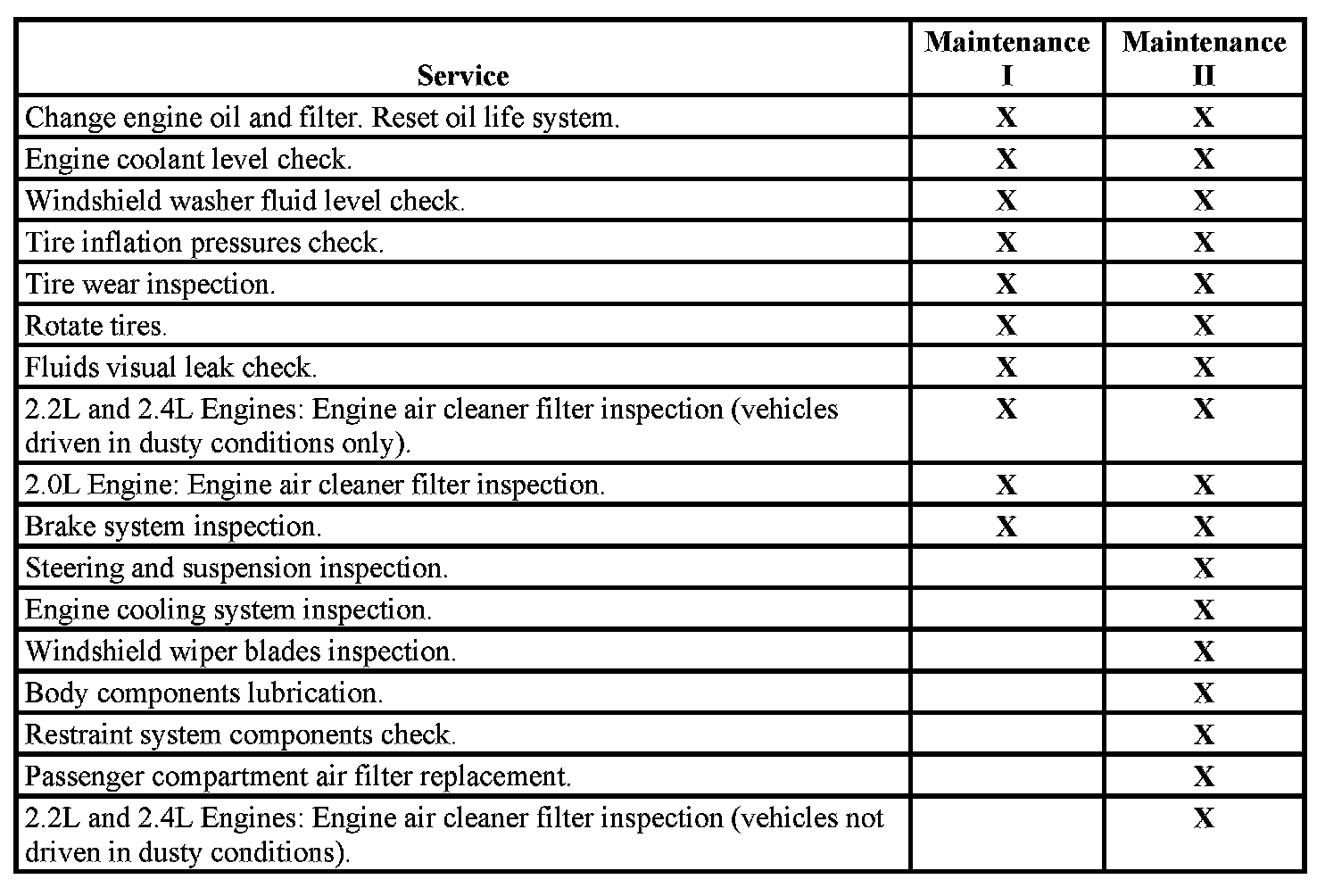 2.2L and 2.4L Engines: Engine air cleaner filter inspection (vehicles not driven in dusty conditions).