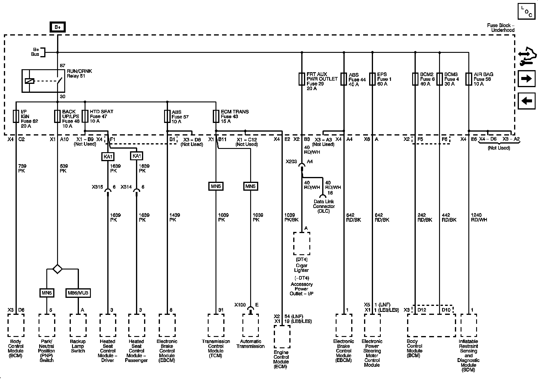 Underhood Fuse Block - ABS (10A), ABS (30A), BACK UP/LPS, BCM 2, BCM3, ECM TRANS, EPS, FRT AUX PWR OUTLET, HTD SEAT, I/P IGN, PRK/NEUT, S-BAND Fuses
