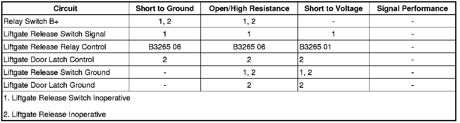 • If the liftgate door latch does not activate, test the control circuit for a short to ground or an open/high resistance. If the circuit tests normal, test or replace the liftgate door latch.