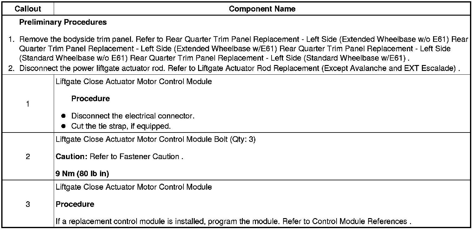Liftgate Close Actuator Motor Control Module Replacement (Except Avalanche and Escalade EXT)