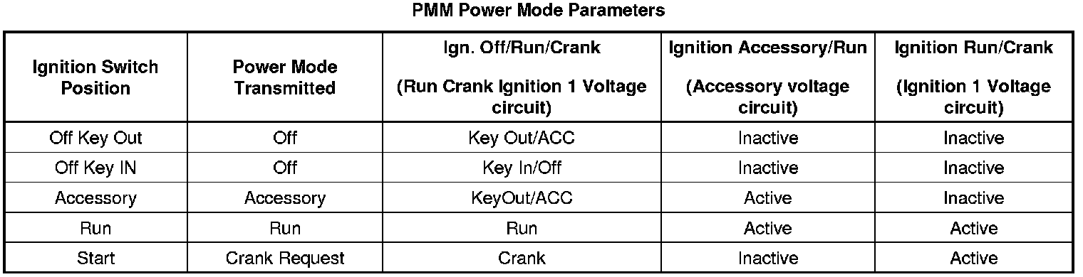 The PMM receives ignition switch signals to identify the operators desired power mode. The PMM Power Mode Parameters table below illustrates the correct state of these input parameters (circuits) in correspondence to the ignition switch position: