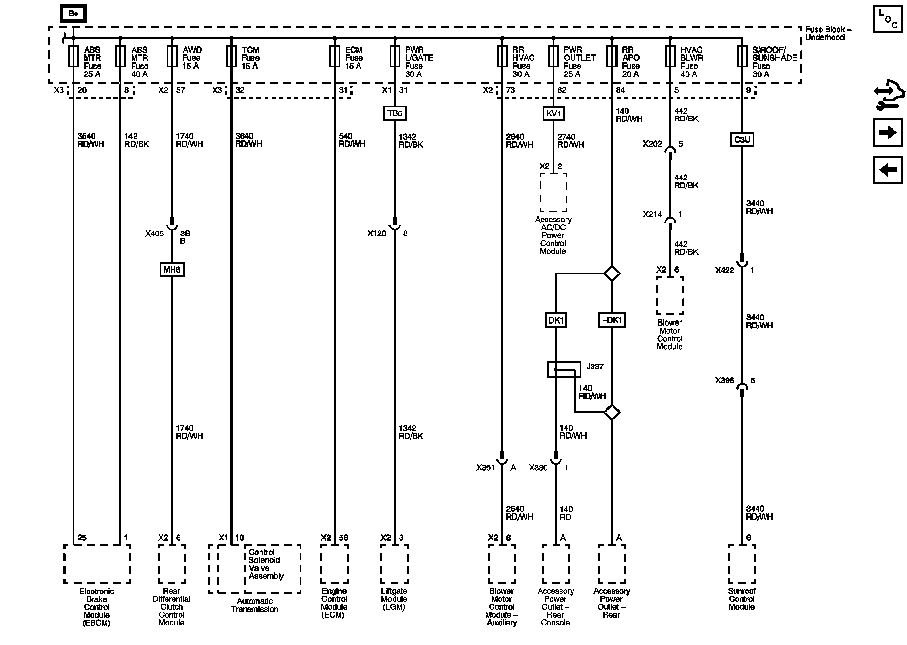 ABS MTR, ABS MTR, AWD, ECM, HTD WASH, HVAC BLWR, PWR L/GATE, PWR OUTLET, RR APO, RR HVAC, S/ROOF/SUNSHADE and TCM Fuses