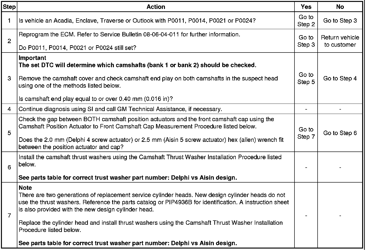 4. If the wrench fits between the camshaft position actuator and the front camshaft cap, it will be necessary to replace the cylinder head assembly and replace both actuators. It is not necessary to replace the camshaft position actuators on the cylinder head that is not being replaced. WHEN REPLACING THE CYLINDER HEAD, ALSO INSTALL A THRUST WASHER BETWEEN EACH CAMSHAFT POSITION ACTUATOR AND THE FRONT CAMSHAFT CAP. See parts table for correct trust washer part number: Delphi vs Aisin design.