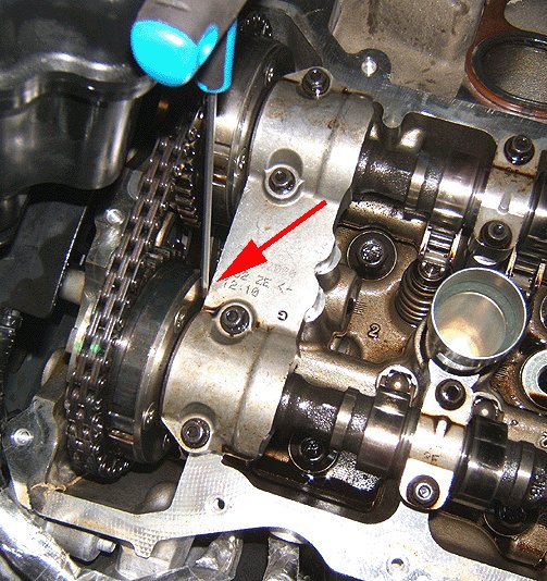 Use a 2.5 mm hex (allen) wrench as a determination gauge to measure the gap between the rear of the camshaft position actuator and the front camshaft cap of both camshafts of the suspect head.