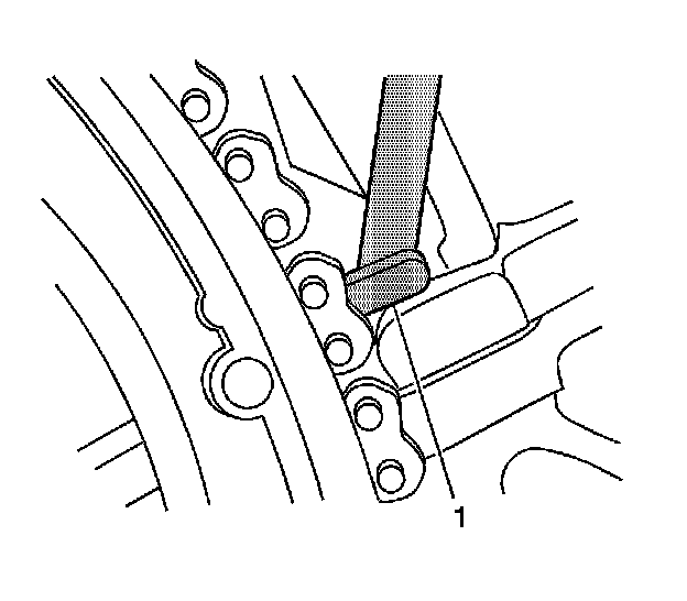 Ensure that the foot (1) of the Timing Chain Retention Tool is engaged into one of the link pockets to prevent tool slippage during tightening of the Timing Chain Retention Tool.