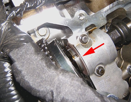 17. Move the camshaft position actuator forward enough to slip the camshaft thrust washer over the front of the intake camshaft and position it against the cylinder head.