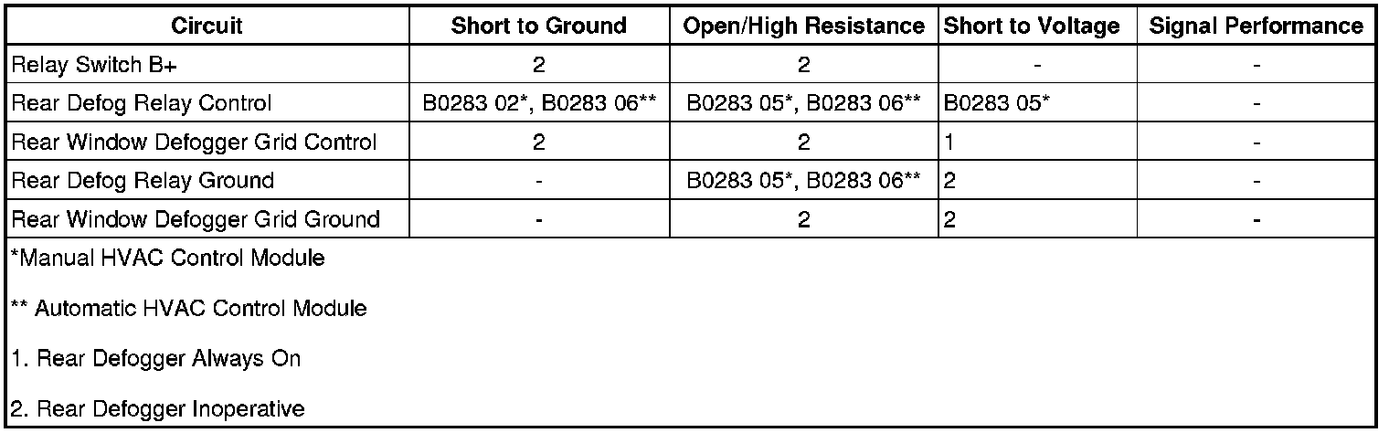 The HVAC control module detects a short to ground or open/high resistance in the rear defog relay control circuit for 1 second or greater.