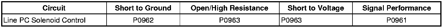 The transmission control module detects an internal low voltage electrical malfunction of the line pressure control solenoid control circuit for 300 milliseconds.