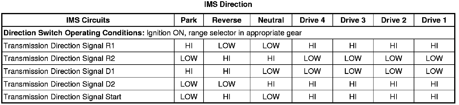 The automatic transmission manual shift shaft position switch assembly, also called the transmission internal mode switch assembly, is a dual sliding contact switch attached to the control valve body within the transmission. The 9 outputs from the switch indicate which position is selected by the transmission manual shaft. Four outputs (A, B, C, P) are range selection inputs to the transmission control module (TCM). Five outputs (R1, R2, D1, D2, S) are direction selection inputs to the hybrid powertrain control module. The input voltage at the modules is high when the switch is open and low when the switch is closed to ground. The state of each input is displayed on the scan tool as IMS Range and IMS Direction. The IMS Range input parameters represented are transmission range signal A, signal B, signal C, and signal P. The IMS Direction input parameters represented are transmission direction signal R1, signal R2, signal D1, signal D2, and signal Start.