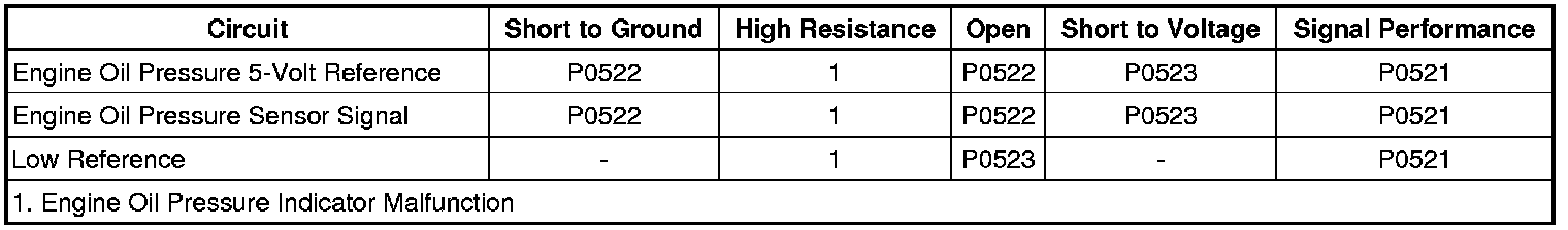 The engine oil pressure (EOP) sensor changes voltage based on the engine oil pressure. The EOP sensor is a 3-wire sensor comprising of the signal circuit, the low reference circuit and the 5-volt reference circuit. The engine control module (ECM) supplies 5 volts to the EOP sensor via the 5-volt reference circuit and provides ground via the EOP low reference circuit. The ECM monitors the signal circuit of the EOP sensor to determine the EOP sensor voltage is within the normal operating range of approximately 1-4 volts. When the engine oil pressure is high, the EOP sensor voltage is high and the ECM senses a high signal voltage. When the engine oil pressure is low, the EOP sensor voltage is low and the ECM senses a low signal voltage. The ECM sends the EOP information via the serial data circuit to the body control module (BCM). The BCM then sends the EOP information to the instrument panel cluster (IPC) via the serial data circuit.