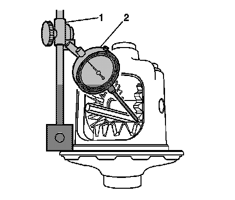 2. Place the contact pad of the J 8001 - indicator (2) on one of the teeth of the pinion gear closest to the pinion shaft lock bolt and zero the gauge.