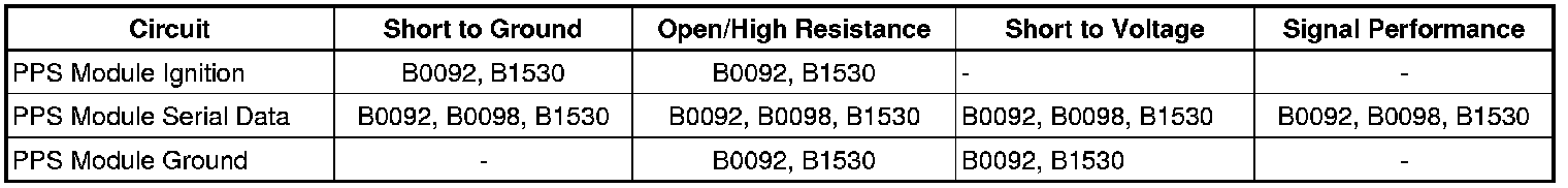 Important: DTC B0092 or DTC B0098 will set if the PPS module has a malfunction, and has set any one of the following DTCs 023, 024, 063, 064, or 065. When DTC B0092 or DTC B0098 is present, it is important to check the PPS module for any current DTC. Refer to Passenger Presence System Flash Code Procedures (Component Tests and General Diagnostics). If the PPS module has any current DTC, address those DTC before performing this diagnostic procedure.