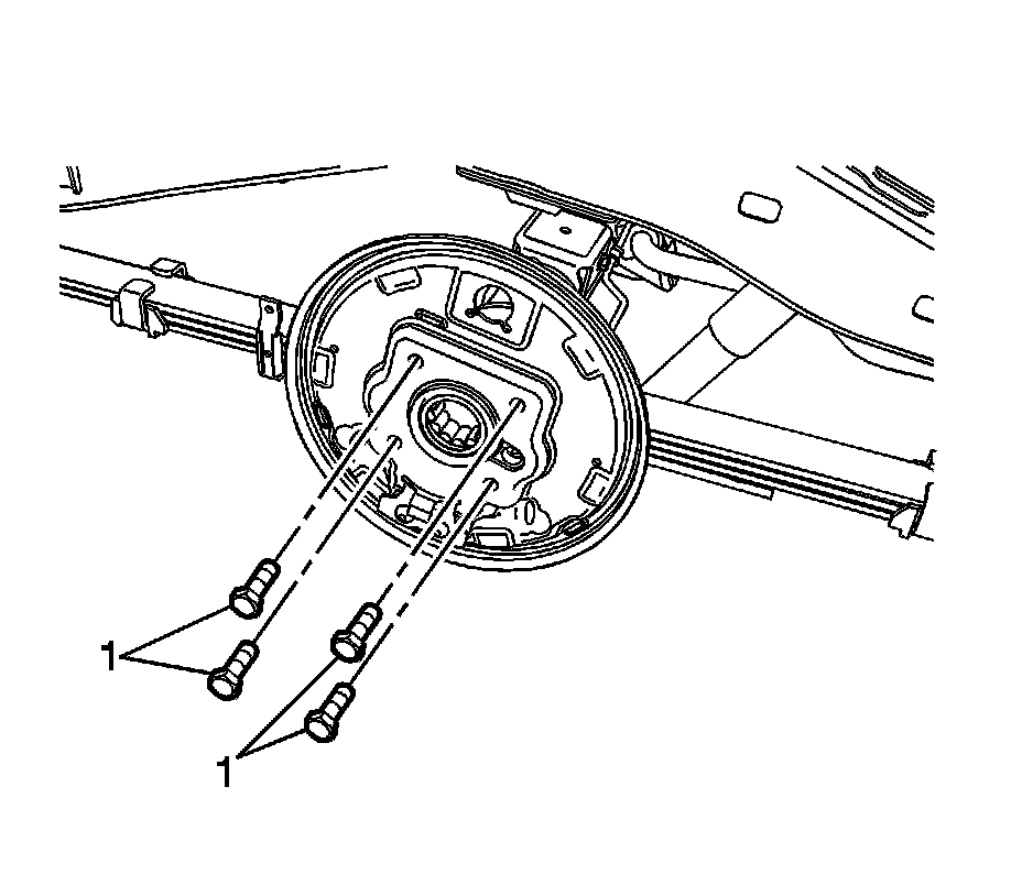 6. Remove the rear brake backing plate bolts (1).