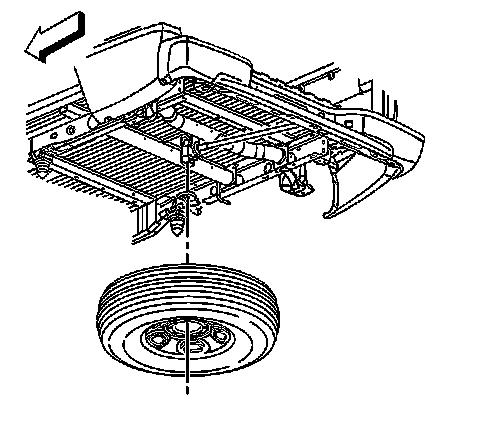 2. Turn the hoist shaft counterclockwise to lower the spare tire to the ground. Continue to turn the hoist shaft until the spare tire can be pulled out from under the vehicle and removed. If the spare tire does not lower to the ground, the secondary latch is engaged causing the tire not to lower.