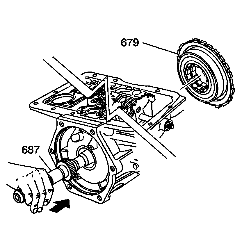 4. Push on the output shaft (687) in order to loosen the low and reverse clutch support (679).