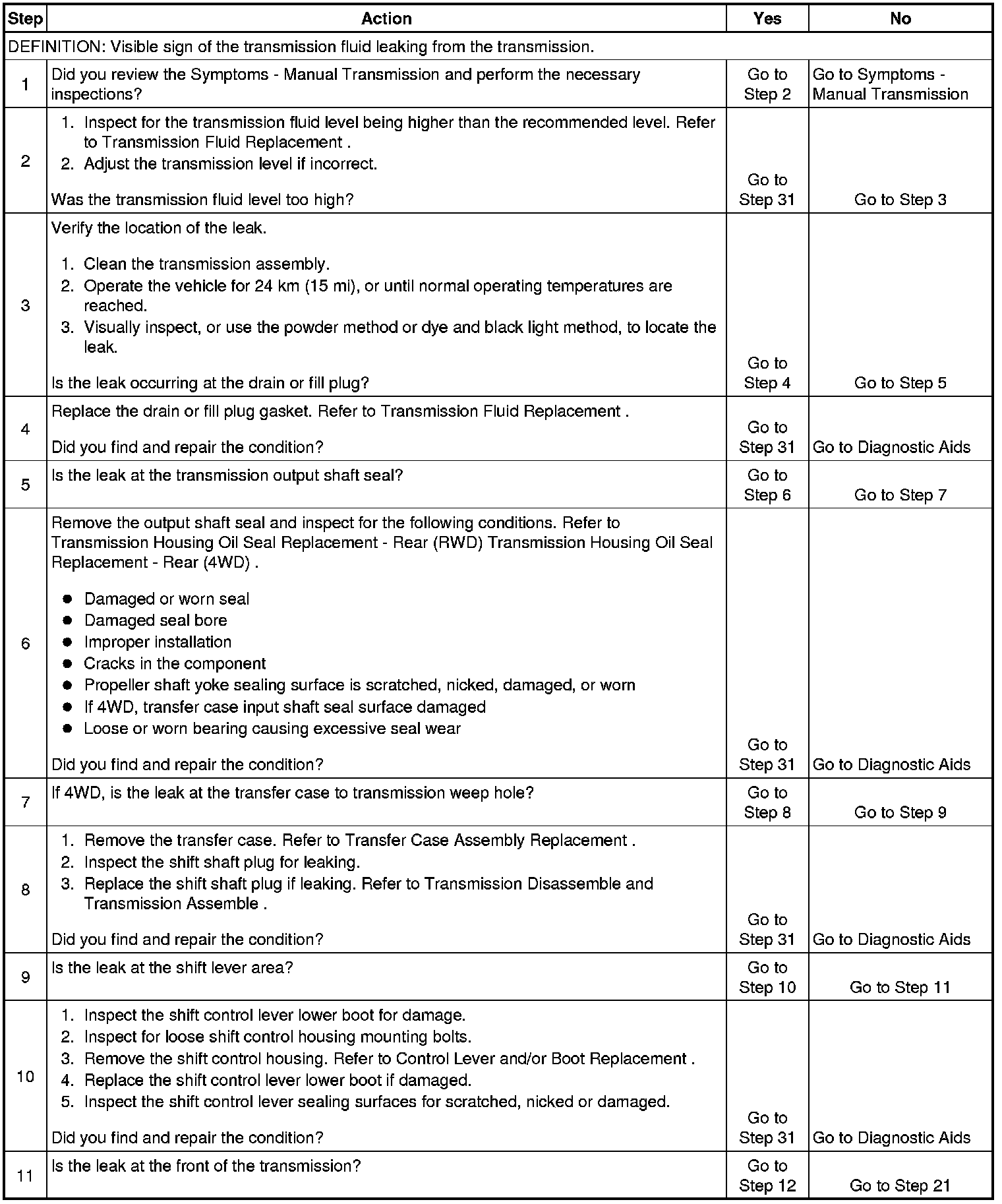 7. With the 4WD application, a weep hole is located at the transfer case to transmission flange. If fluid is leaking at the weep hole, verify if it is transmission fluid or transfer case fluid.
