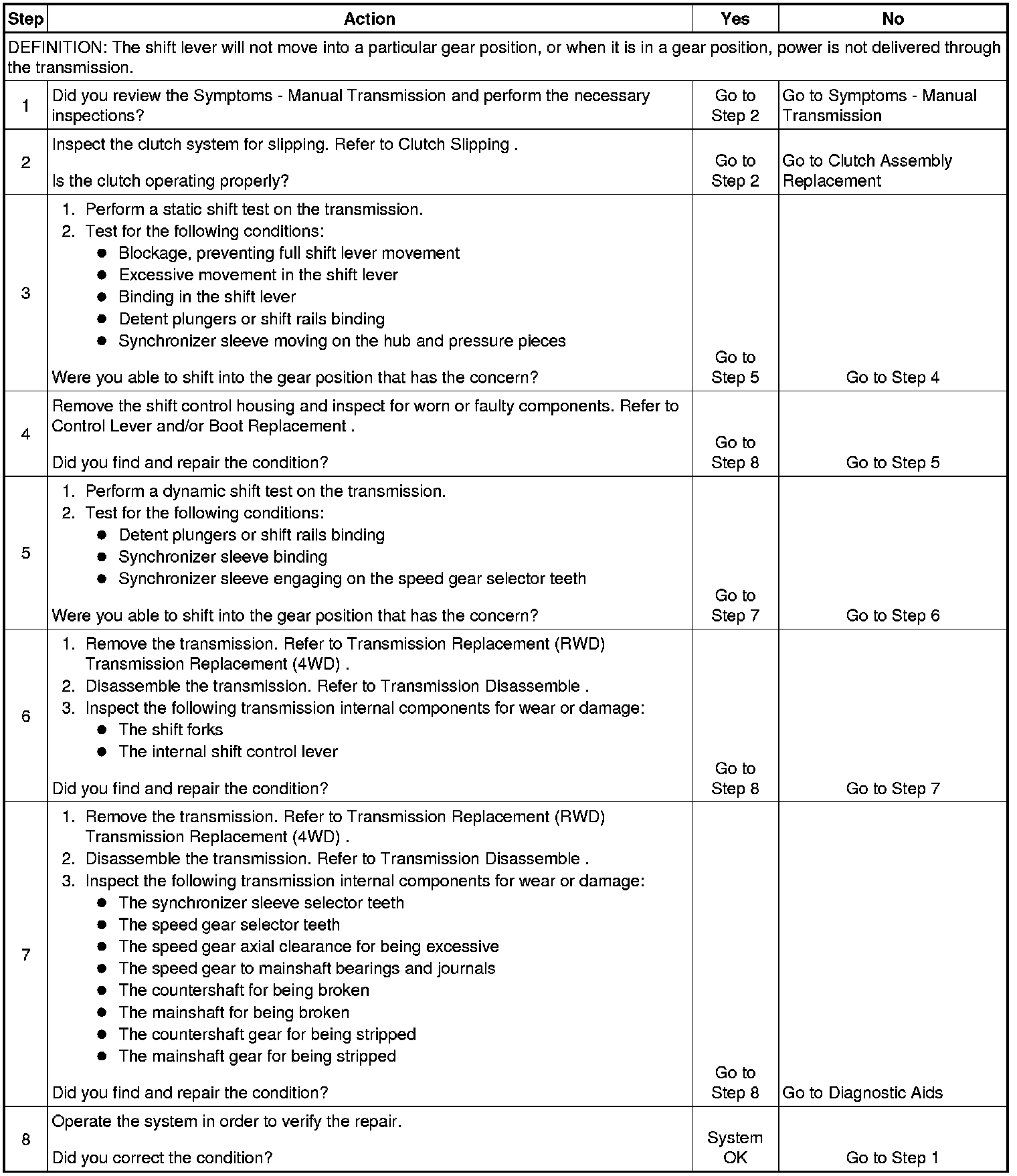 If the transmission shifts into gear and then jumps out of gear, refer to Transmission Jumps Out of Gear (Transmission Jumps Out of Gear). If the vehicle is equipped with a transfer case, during certain load conditions, the transfer case may fail. If it is an intermittent condition, other driveline components may be faulty.