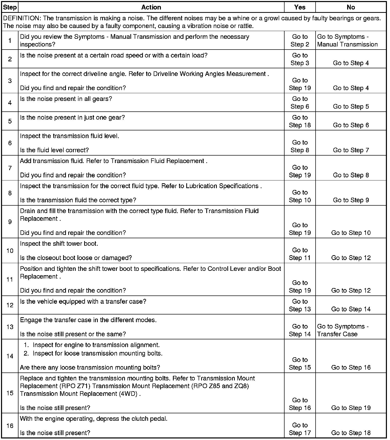 16. This step tests to determine if clutch components are making the noise. Depress the clutch pedal slowly and listen for the change in noise. If the noise changes while pressing the pedal, the transmission component is faulty. If the noise does not change until the clutch is completely disengaged, it may be a faulty clutch component.