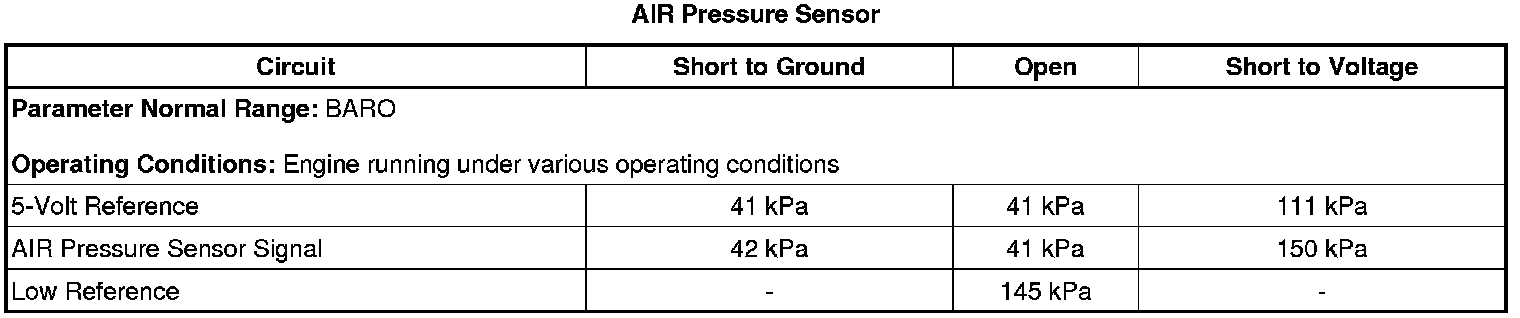 3. Compare the scan tool Air Pressure Sensor pressure parameter to the BARO reading. The readings should be within 3 kPa (0.5 psi).
