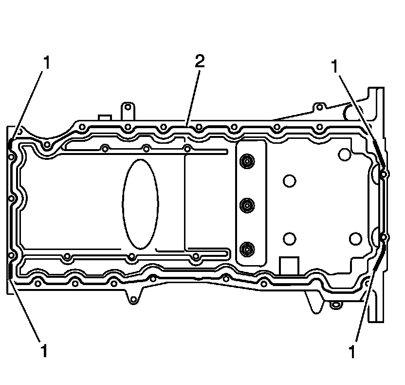 1. Apply a 5.5 mm (0.22 in) bead of sealer to the oil pan in the areas marked (1). Refer to Adhesives, Fluids, Lubricants, and Sealers (Adhesives, Fluids, Lubricants, and Sealers).