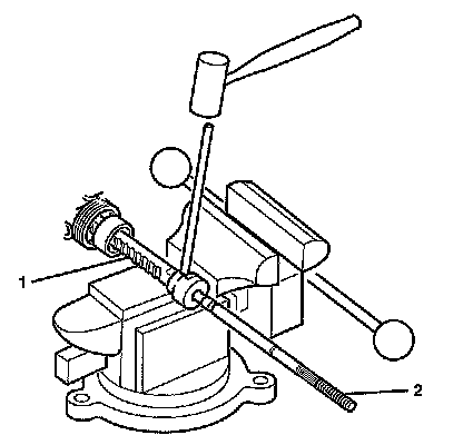 Note: If the steering gear has a female rack (1) and a male inner tie rod (2), do not stake. If the steering gear has a male rack and a female inner tie rod, you must stake.