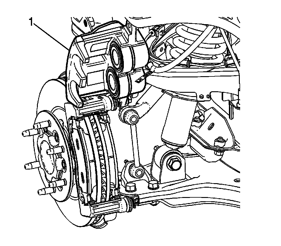 Caution: Support the brake caliper with heavy mechanic wire, or equivalent, whenever it is separated from its mount and the hydraulic flexible brake hose is still connected. Failure to support the caliper in this manner will cause the flexible brake hose to bear the weight of the caliper, which may cause damage to the brake hose and in turn may cause a brake fluid leak.