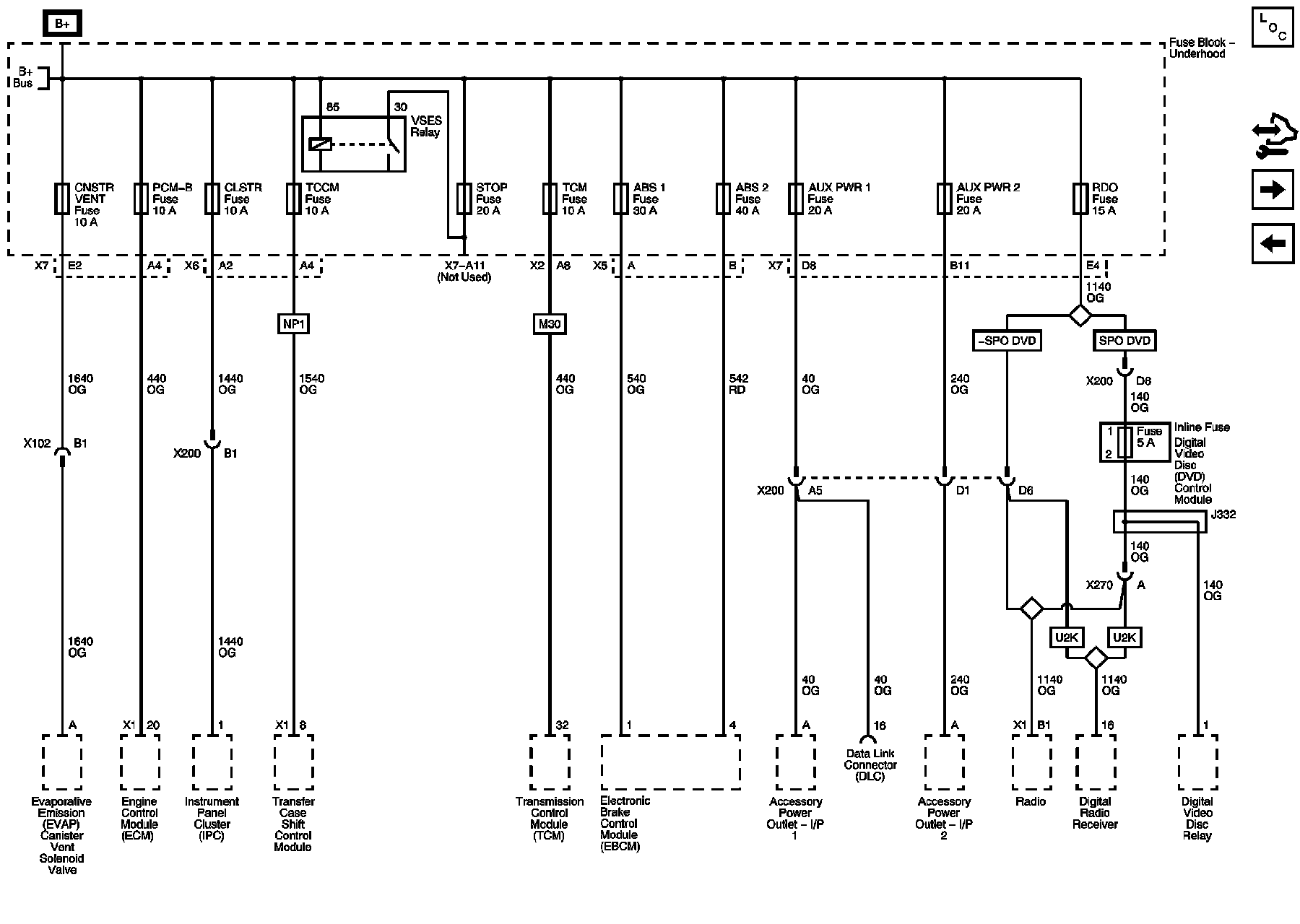 ABS 1, ABS 2, AUX PWR 1, AUX PWR 2, CNSTR VENT, CLSTR, PCM B, RDO, STOP, TCM, and TCCM Fuses