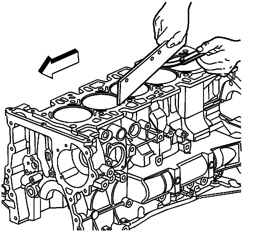 7. Use a straight edge and a feeler gauge to check the deck surface for flatness. Carefully remove any minor irregularities. Replace the block if there is more than 0.08 mm (0.003 in) gap.