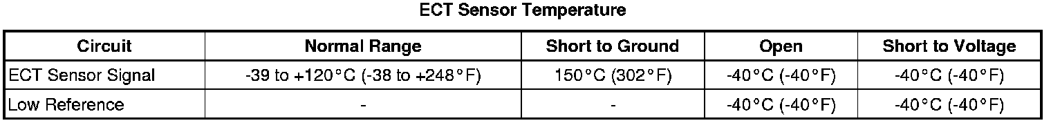 Measure and record the resistance of the ECT sensor at various ambient temperatures, then compare those measurements to the Temperature vs Resistance table. Refer to Temperature Versus Resistance (Temperature Versus Resistance).