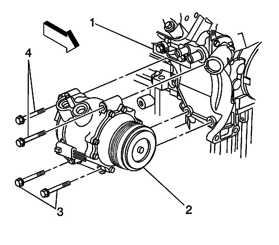 8. Tighten the 2 upper A/C compressor bracket bolts (4) to 50 Nm (37 lb ft).