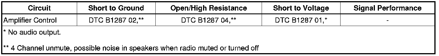 The radio amplifier control circuit provides varying pulse width modulated (PWM) signals to control overall muting of the amplifier. The PWM signals are varying duty cycle percentages ranging from 0-100 percent. A low duty cycle unmutes all amplifier channels and a high duty cycle mutes all amplifier channels. The amplifier control circuit will measure less than 1 V when the mute function is OFF, and approximately 8 V DC when at full mute. The radio monitors the amp control circuit for faults.