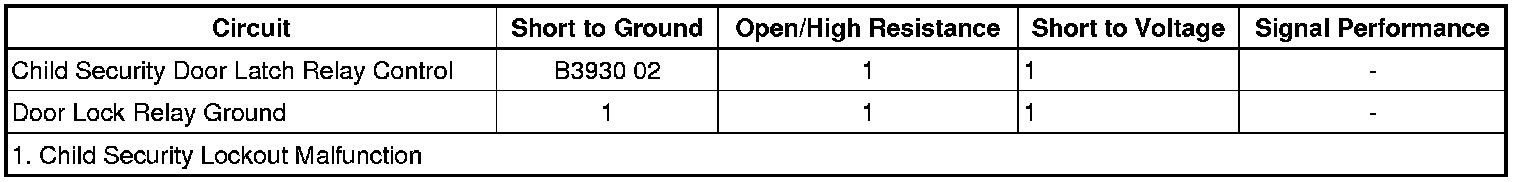 The body control module (BCM) controls the child security lock relay when it receives a command to lockout the rear doors. The relay will apply voltage to both child security circuits at the rear door latches to disable the interior rear door handles.