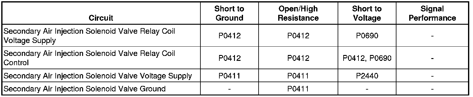 • If the test lamp is always OFF, test the ignition circuit for a short to ground, or an open/high resistance. If the circuit tests normal, replace the Secondary Air Injection Solenoid Valve relay.