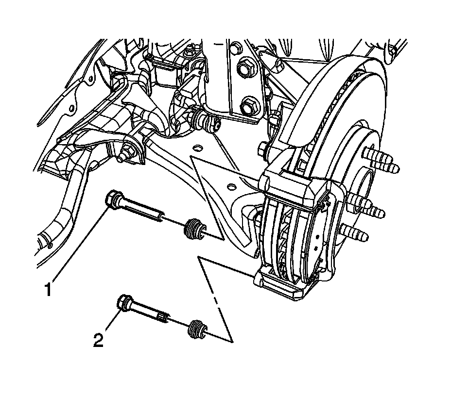 Caution: Support the brake caliper with heavy mechanic wire, or equivalent, whenever it is separated from its mount and the hydraulic flexible brake hose is still connected. Failure to support the caliper in this manner will cause the flexible brake hose to bear the weight of the caliper, which may cause damage to the brake hose and in turn may cause a brake fluid leak.