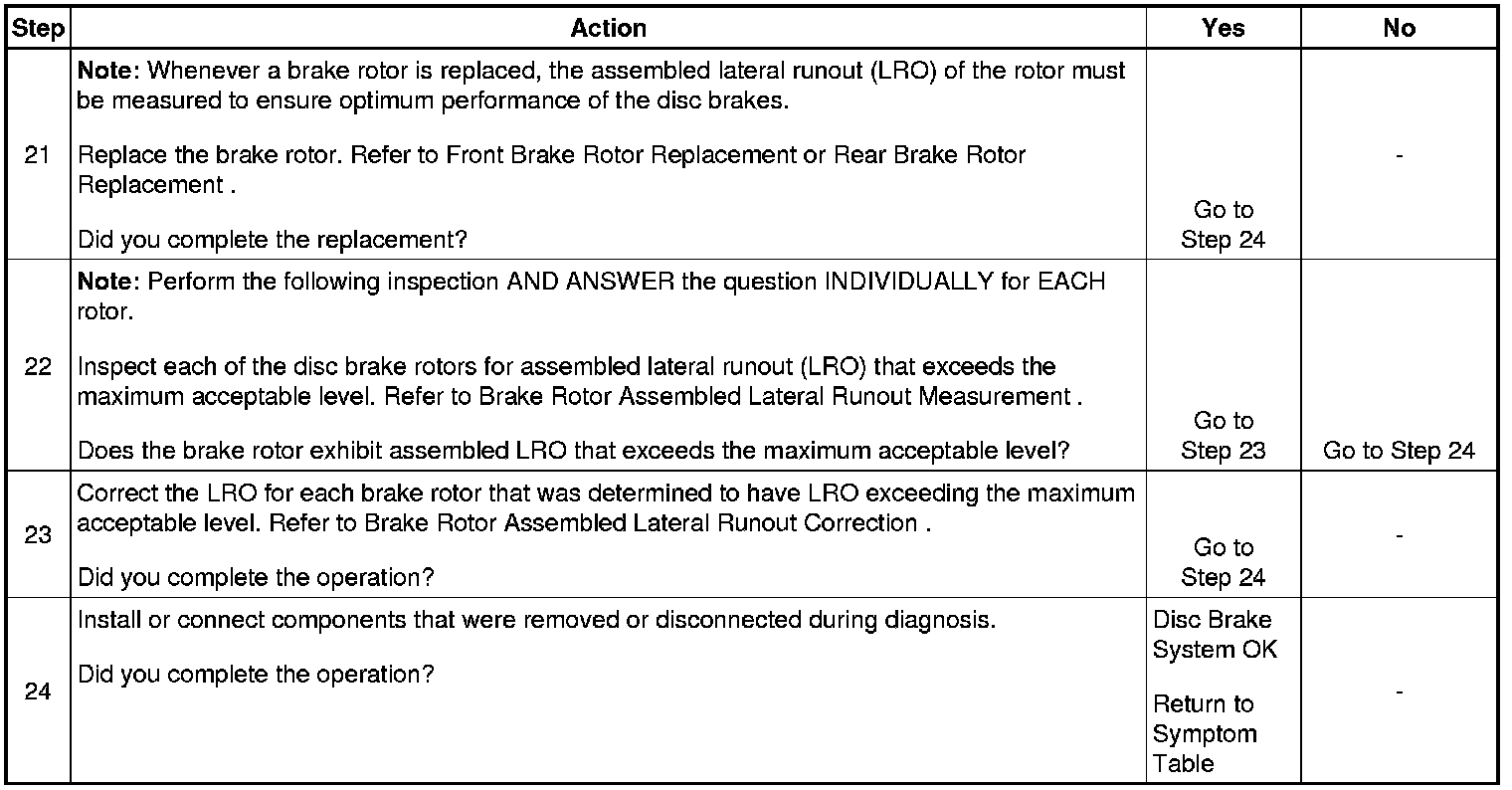 22. Disc brake rotor assembled lateral runout (LRO) that exceeds the maximum acceptable level can lead to thickness variation.