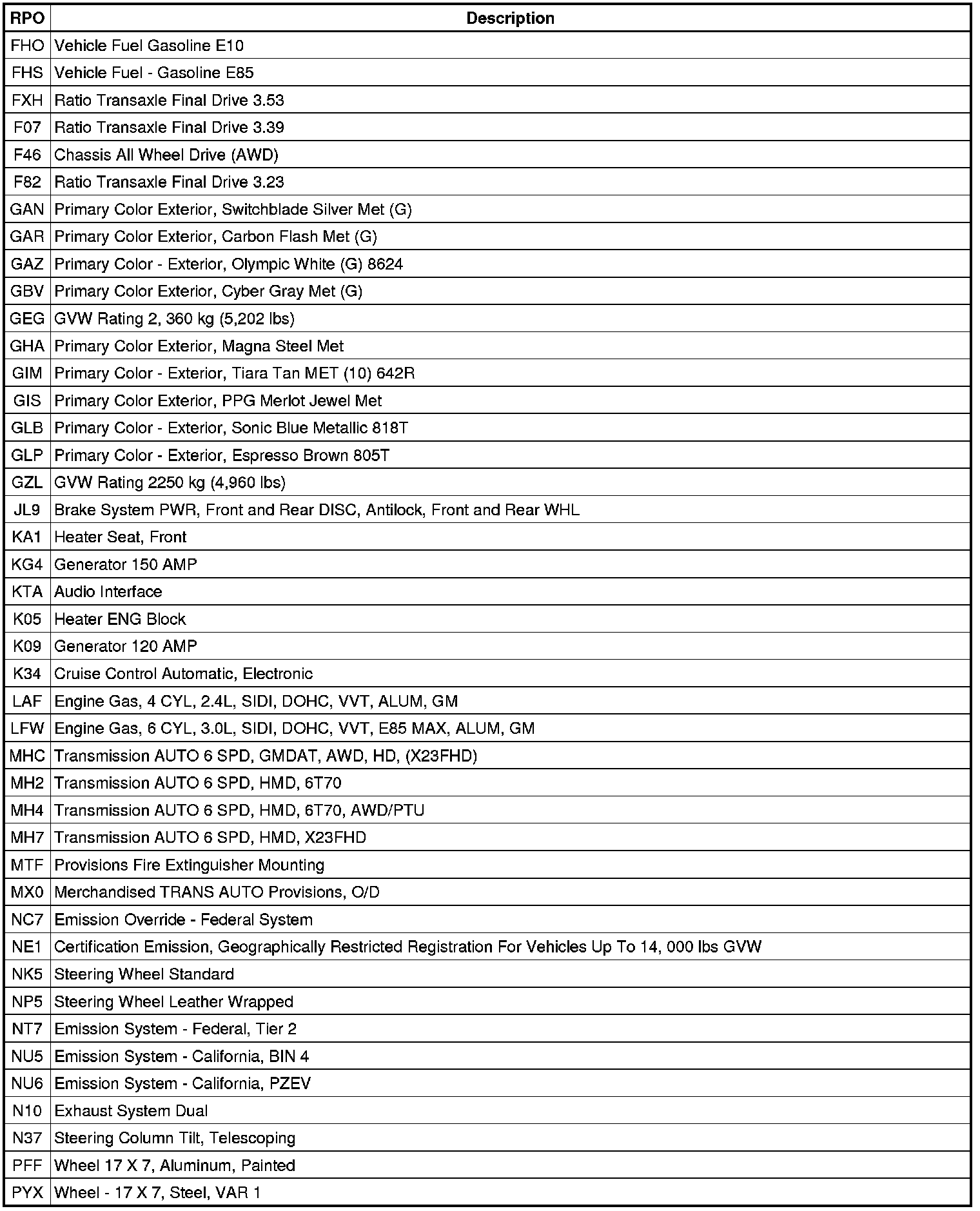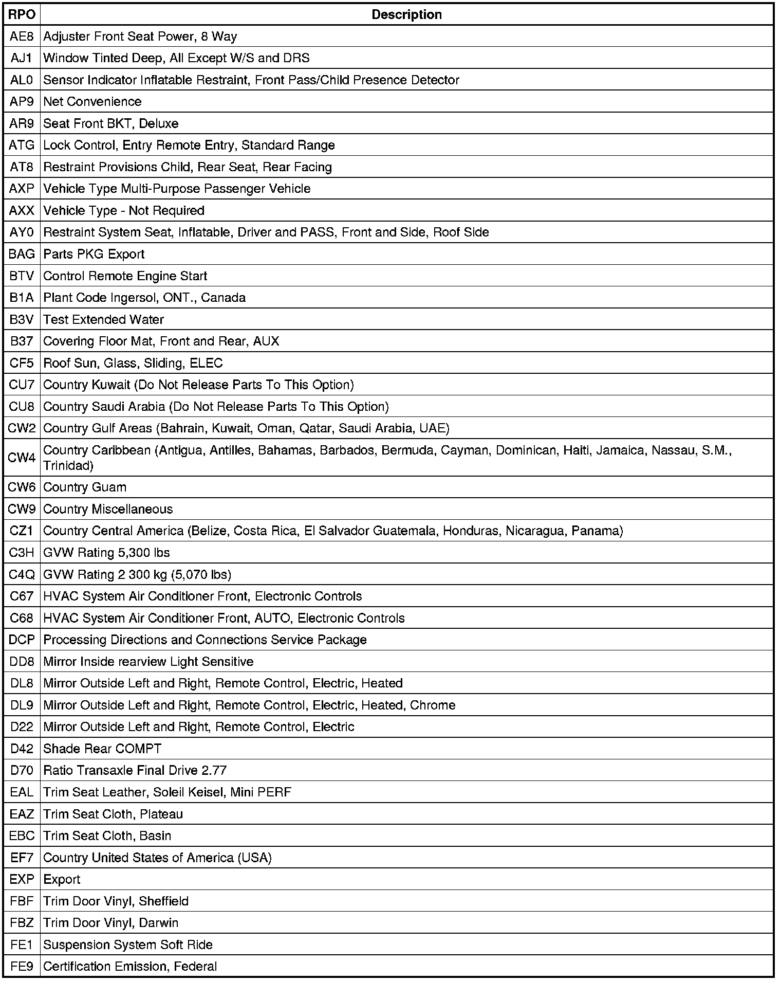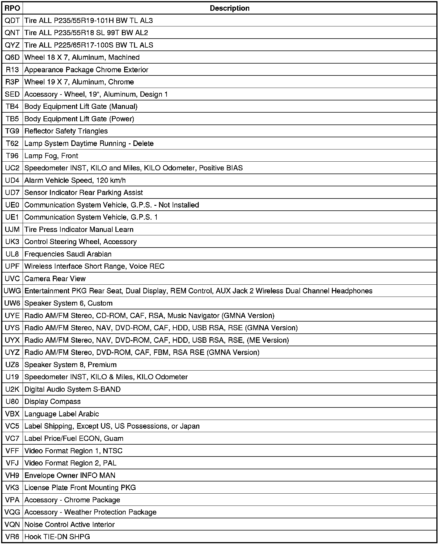 The following table provides the description of the RPO codes that are available on the vehicle. The vehicles RPO list is printed on the Service Parts Identification Label.