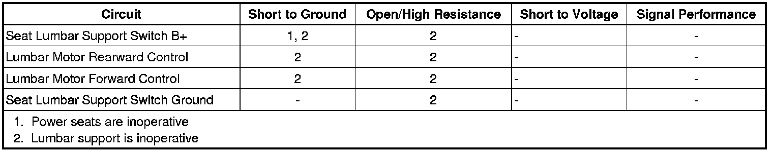 The lumbar motor is reversible. For example, when the lumbar forward switch is pressed to move the lumbar support forward, battery voltage is applied through the switch contacts and the lumbar motor forward control circuit to the motor. The motor is grounded through the lumbar motor rearward switch contacts and the lumbar motor rearward control circuit to the motor. The motor runs in order to drive the lumbar support forward toward the occupants back until the switch is released. Moving the lumbar support rearward works similarly to moving the lumbar support forward, except that battery positive voltage and ground are applied on opposite circuits causing the motor to run in the opposite direction.