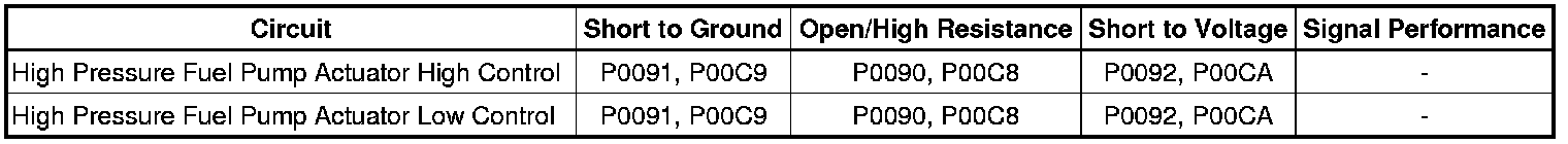 * The ECM detects a short to ground in the high pressure fuel pump actuator high control circuit.