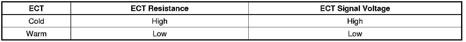 The engine coolant temperature (ECT) sensor is a variable resistor that measures the temperature of the engine coolant. The engine control module (ECM) supplies 5 V to the ECT signal circuit and supplies a ground to the low reference circuit.