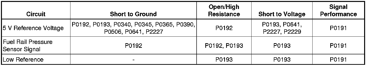 The fuel rail pressure sensor detects fuel pressure within the fuel rail. The engine control module (ECM) provides a 5 V reference voltage on the 5 V reference circuit and ground on the low reference circuit. The ECM receives a varying signal voltage on the signal circuit. The ECM monitors the voltage on the fuel rail pressure sensor circuits. When the fuel pressure is high, the signal voltage is high. When the fuel pressure is low, the signal voltage is low.