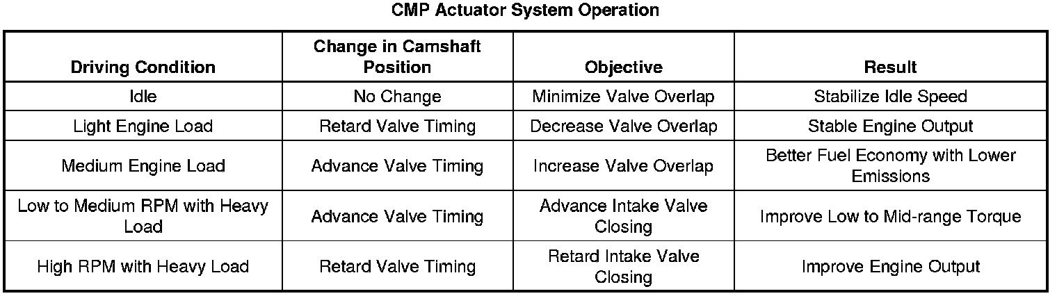 The camshaft actuator system enables the engine control module (ECM) to change camshaft timing of all 4 camshafts while the engine is operating. The CMP actuator assembly (15) varies the camshaft position in response to directional changes in oil pressure. The CMP actuator solenoid valve controls the oil pressure that is applied to advance or retard a camshaft. Modifying camshaft timing under changing engine demand provides better balance between the following performance concerns: