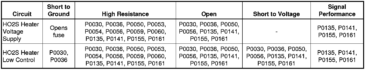 Heated oxygen sensors (HO2S) are used for fuel control and post catalyst monitoring. Each HO2S compares the oxygen content of the surrounding air with the oxygen content in the exhaust stream. The HO2S must reach operating temperature to provide an accurate voltage signal. A heating element inside the HO2S minimizes the time required for the sensors to reach operating temperature. Voltage is provided to the heater by an ignition voltage circuit through a fuse. With the engine running, ground is provided to the heater by the HO2S heater low control circuit through a low side driver within the engine control module (ECM). The ECM uses pulse width modulation (PWM) to control the HO2S heater operation to maintain a specific HO2S operating temperature range.