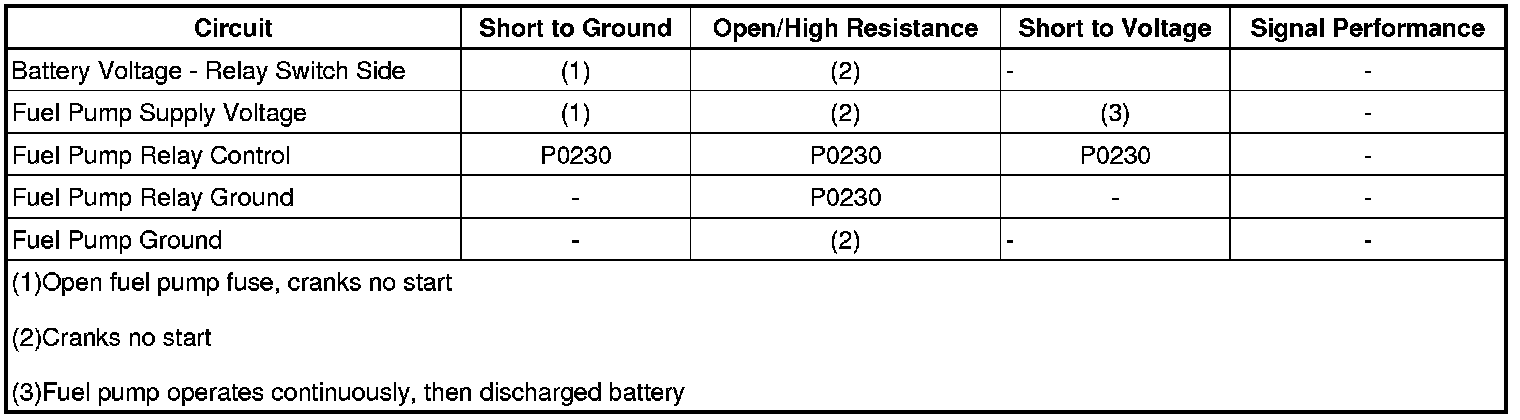 The ECM monitors the voltage on the fuel pump relay control circuit. If the ECM detects an incorrect voltage on the fuel pump relay control circuit, a fuel pump relay control DTC sets.