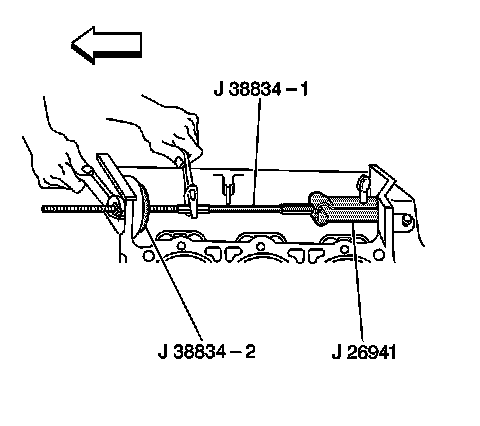 2. Install the J 38834-1 with the short threaded end through the balance shaft bore in the front of the engine block.