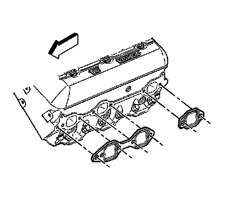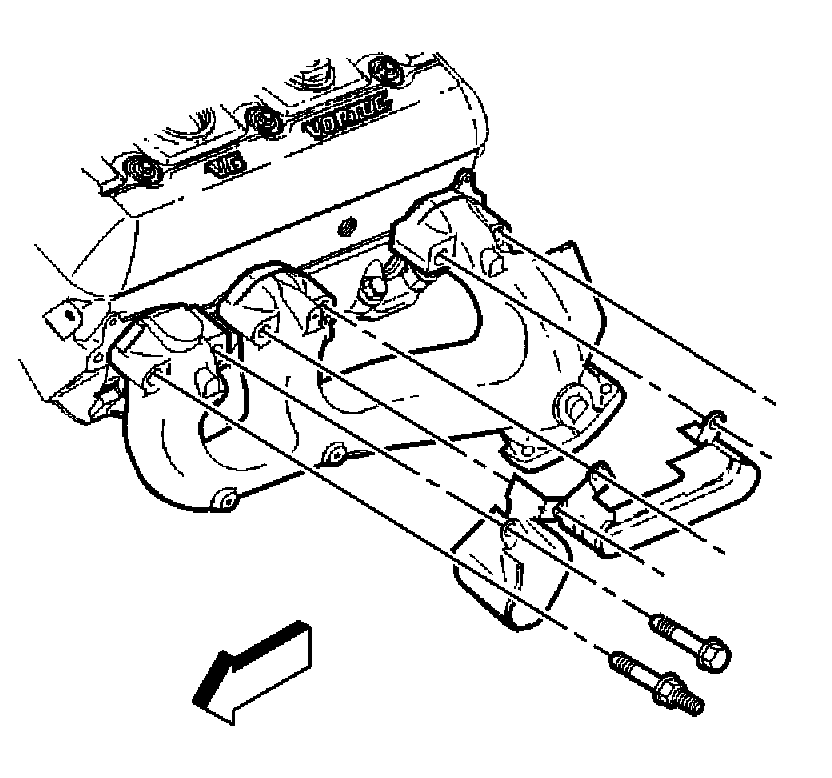 4. If reusing the fasteners, apply threadlock GM P/N 12345493 (Canadian P/N 10953488) or equivalent, to the threads of the exhaust manifold bolts and stud.