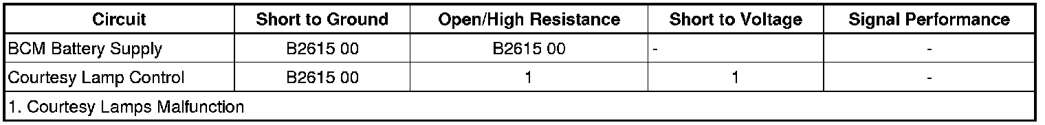 Battery voltage for the courtesy lamps is supplied at all times, from the BCM 3 Fuse located in the underhood fuse block, to the body control module (BCM). When the BCM receives a signal to command the courtesy lamps ON, it applies voltage through the courtesy lamps relay control circuit in order to energize the relay. With the relay energized, battery voltage is applied through switch side of the relay and the courtesy lamp supply voltage circuits to the courtesy lamps listed below.