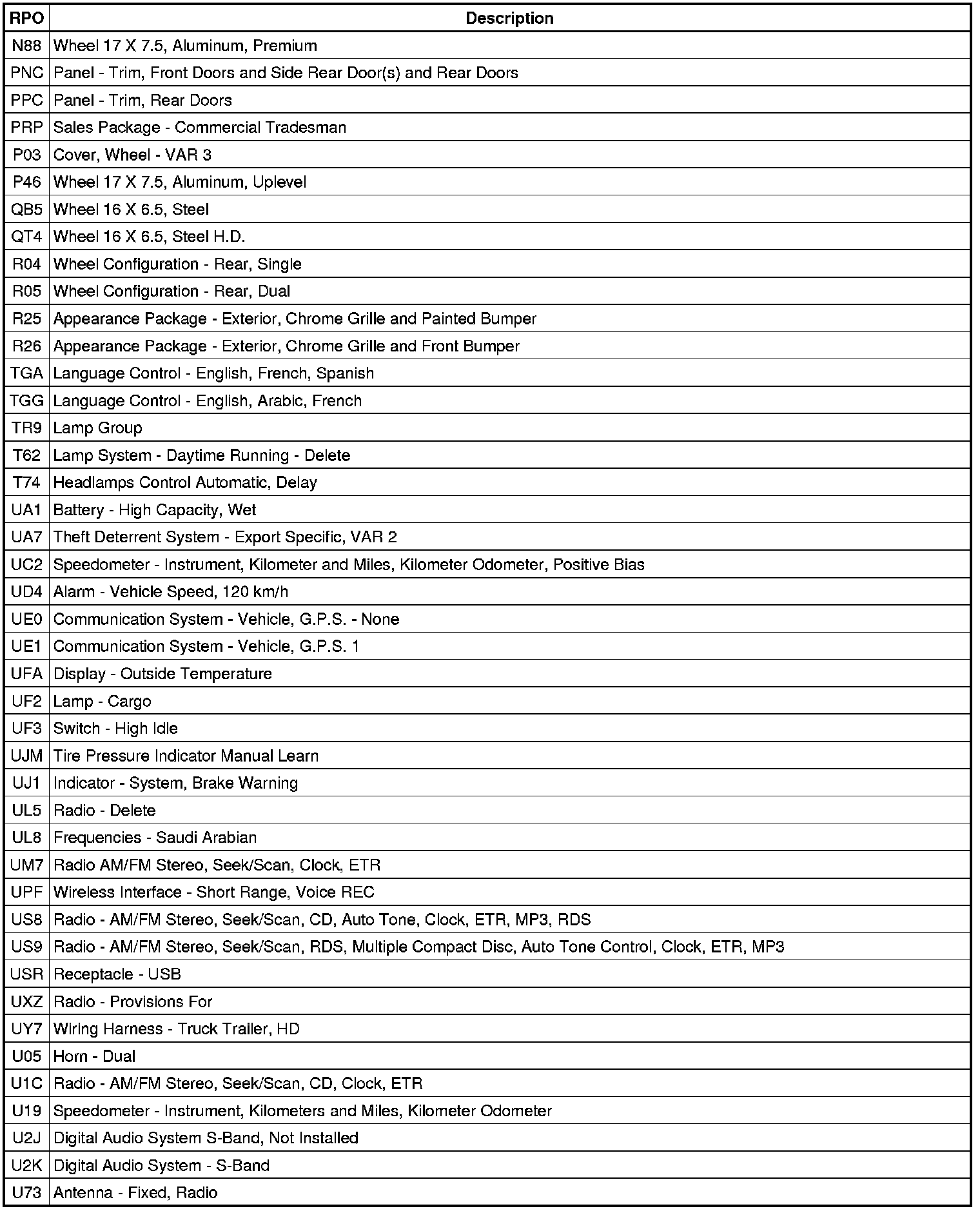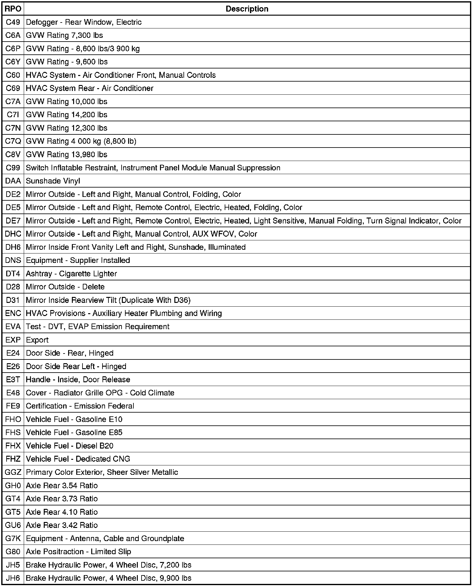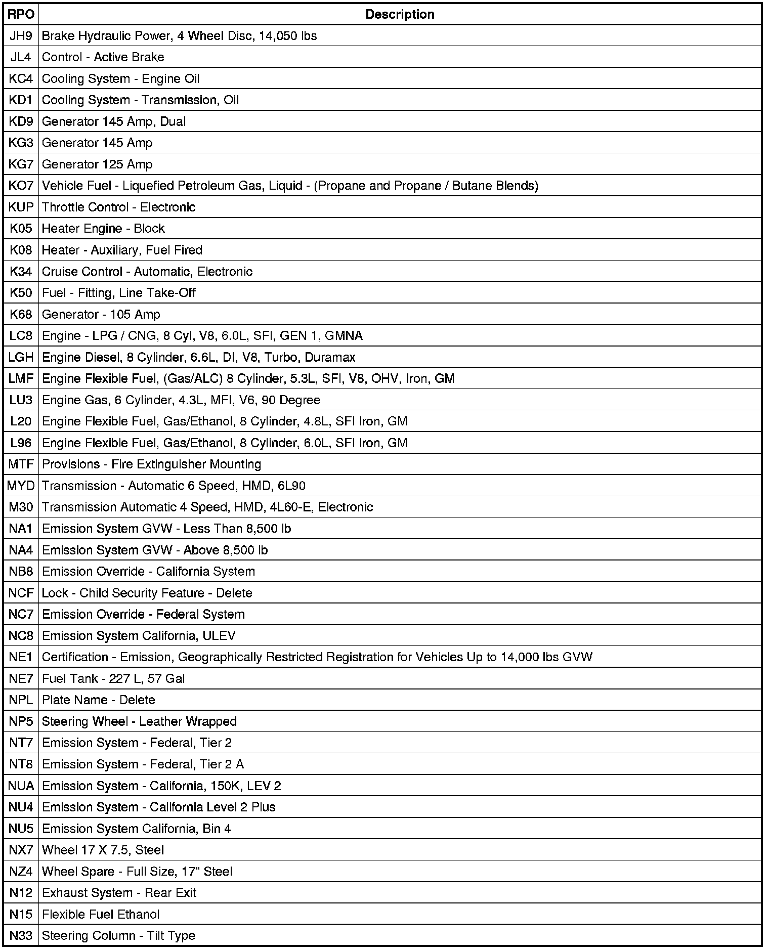 RPO Code List