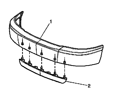 2. Install and fully seat the push-pins that retain the air deflector (2) to the front impact bar (1).